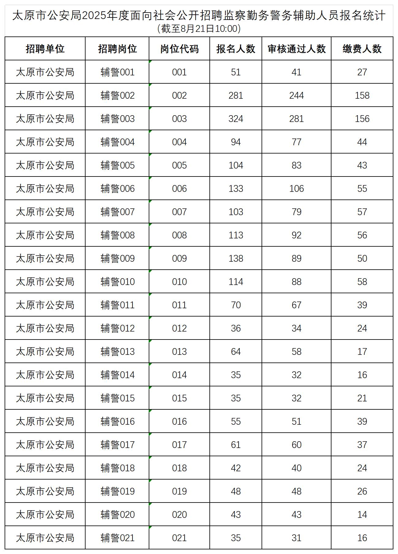 太原市公安局2025年度面向社会公开招聘监察勤务警务辅助人员报名统计(截至8月21日10:00)