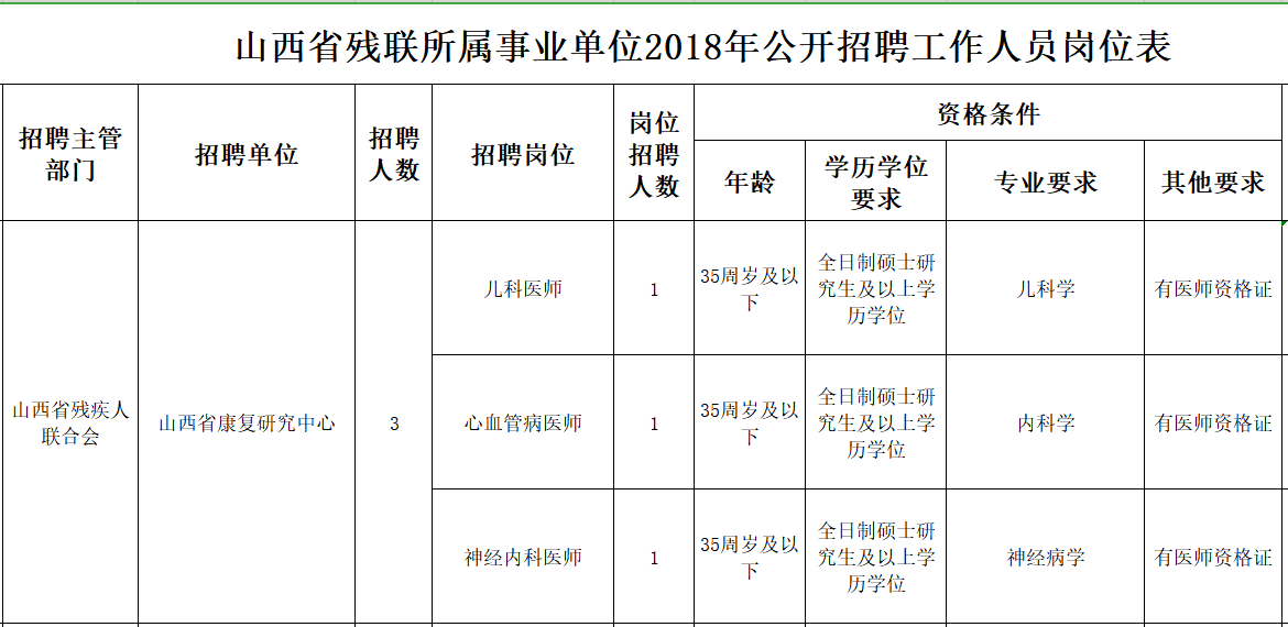 本次共招聘工作人员3名,具体招聘岗位及要求详见《山西省残疾人联合会所属事业单位2018年公开招聘工作人员岗位表》(附表)。
